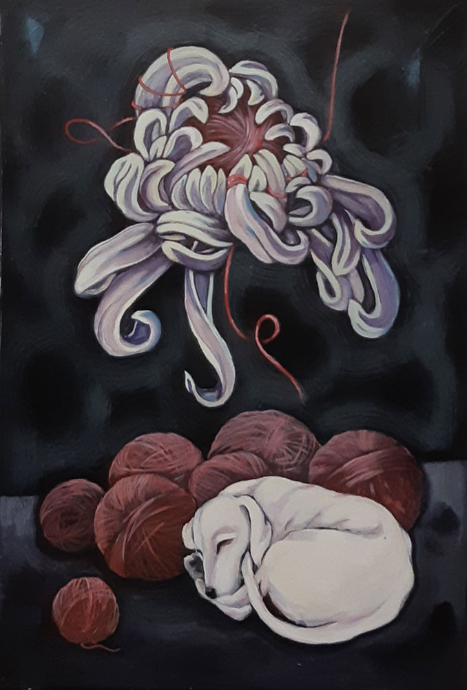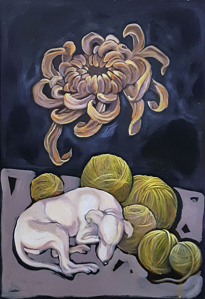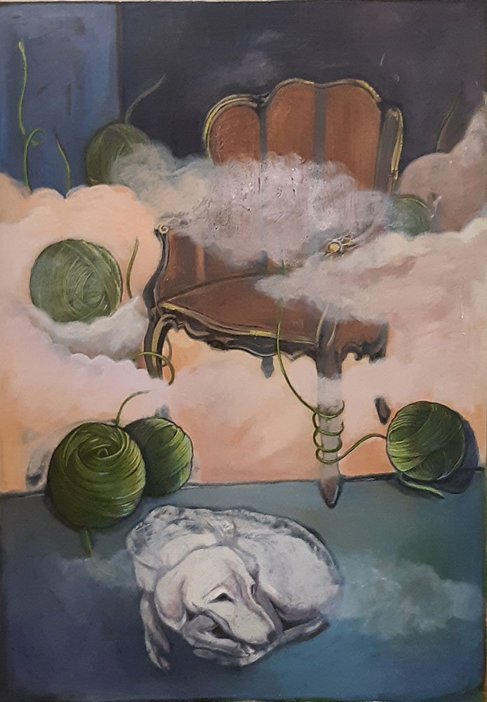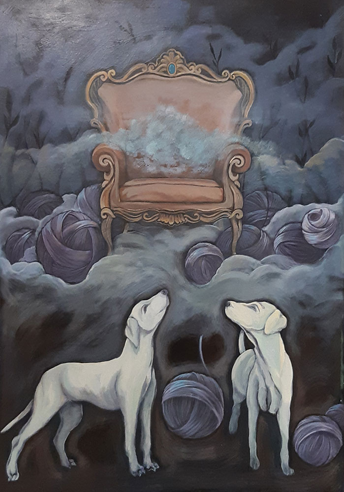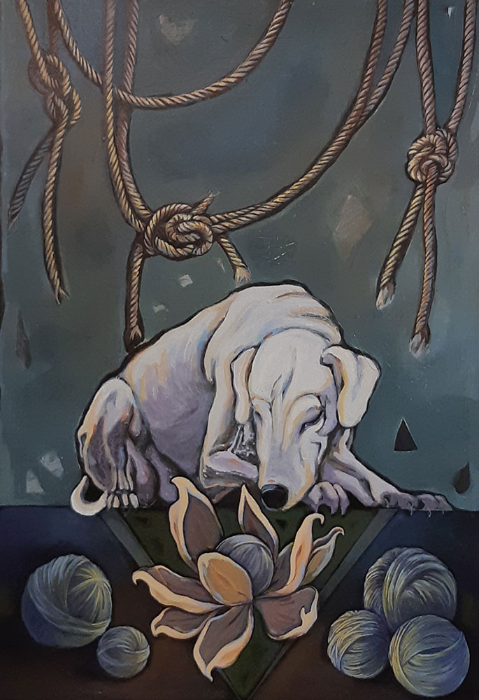 Dog is a symbol of loyalty, without any ego and superego. Circular shape indicates the notions of totality, idea of movement, ultimate state of oneness, Purity, subtlety, and tenderness. Considering yarn with its softness and circularity quality, I have used it in my paintings while showing color of each chakra.