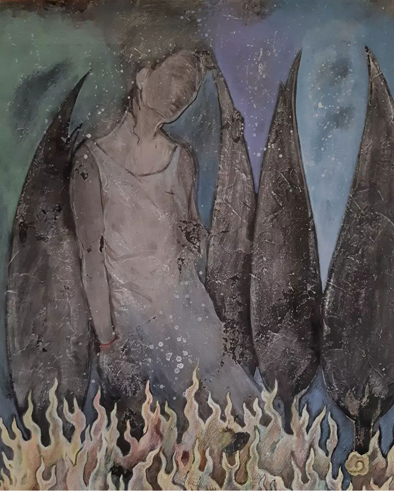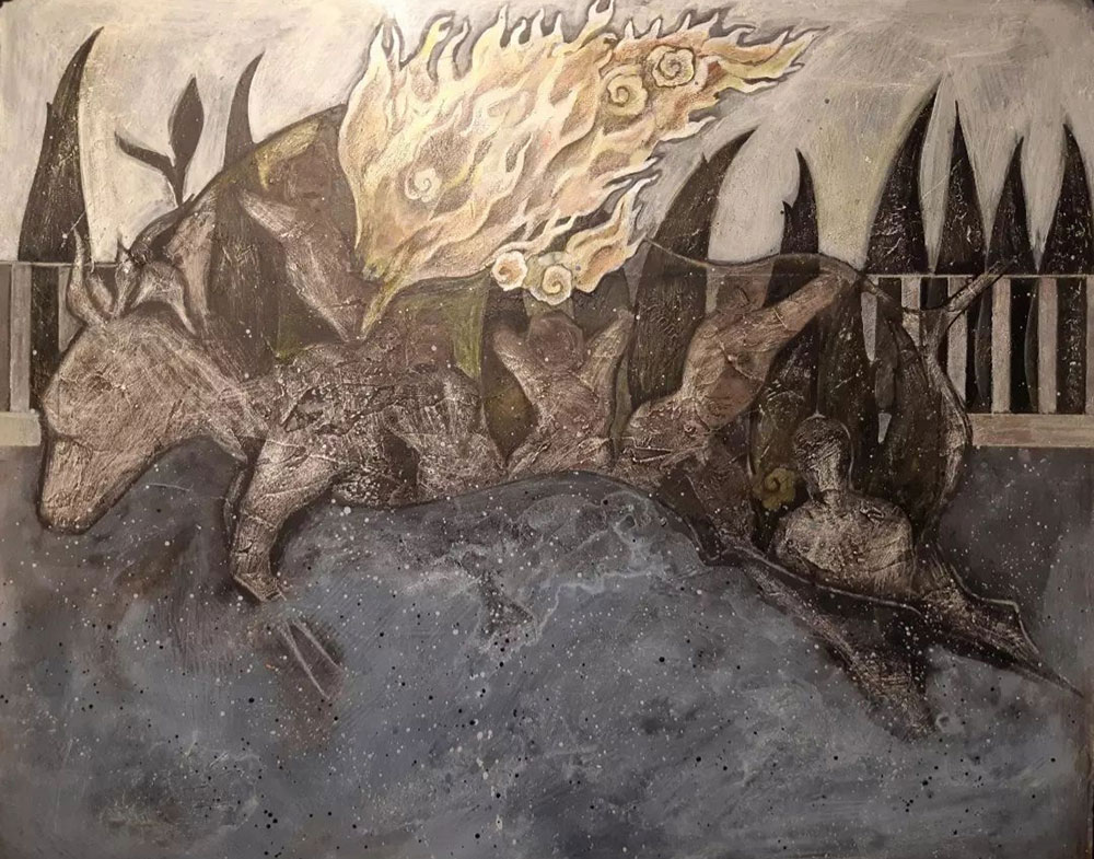 According to Zoroastrianism, fire is a sign of purity and truth. Hadayush is an ancient cow in Zoroastrian myths. This cow helps people to cross the Sea. It inspired me to show the concept of crossing the Nabhi chakra. Cypress is described as a symbol of ascent, freedom, life and has a key place in Iranian culture. It will not deviate to the left or right with the change of factors, internal and external pressures, and maintain its correct growth process. Cypress encourages us to see the natural transitions within the cycle of life. The cypress tree, was seen as a symbol of resistance against darkness, immortality and deathlessness to the Persian prophet Zoroaster. All hadioush series painted by mixed media (acrylic, ink, pastel, charcoal,…)